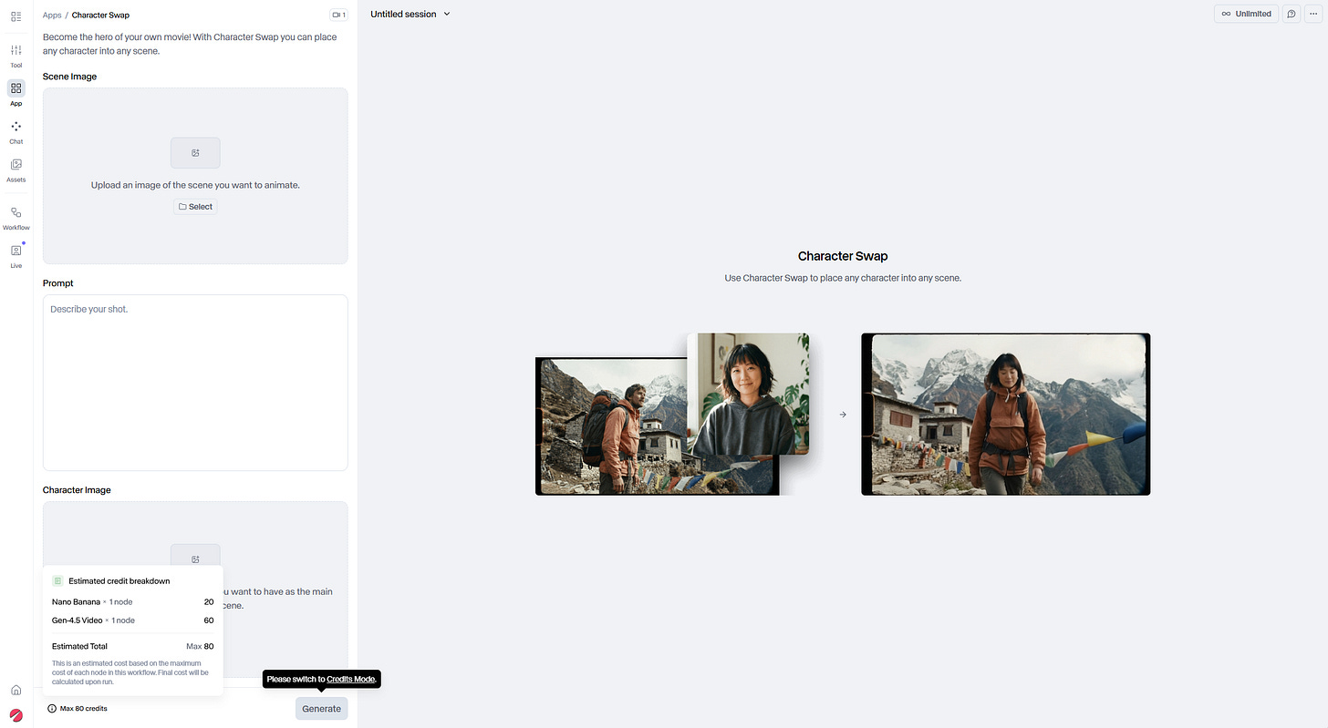 On a ensuite évolué vers des applications qui combinent plusieurs modèles. Par exemple ici dans Runway : on nous propose une application pour changer un personnage sur une vidéo, qui utilise à la fois un modèle image (Nano Banana) et un modèle vidéo (Gen 4.5). Ces applications spécialisées font déjà gagner du temps.
