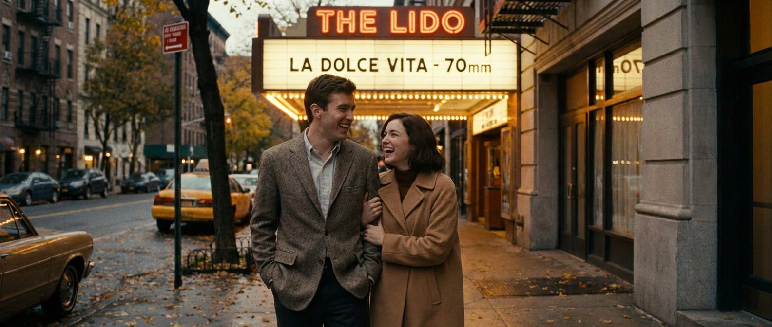 Années 1960, New York, style vestimentaire et décor d’époque. Format cinéma 2.39:1, profondeur de champ courte, qualité cinématographique 35mm. Plan large d’un couple sortant d’un cinéma de quartier sur l’Upper West Side de New York en automne, soirée. Marquise lumineuse avec des lettres rétro derrière eux. Homme, 25 ans, cheveux bruns mi-courts légèrement décoiffés, veste en tweed brun-beige avec coudières, chemise blanche col ouvert, pantalon flanelle gris, chaussures cuir marron. Femme, 25 ans, cheveux châtains longs détachés, manteau camel ceinturé à la taille col relevé, robe bleu marine en dessous, bottes cuir marron, écharpe laine crème. Ils rient ensemble, épaules qui se touchent, complicité évidente. Feuilles mortes sur le trottoir, lumière chaude dorée des néons, tons ambre et brun. Grain de pellicule léger.