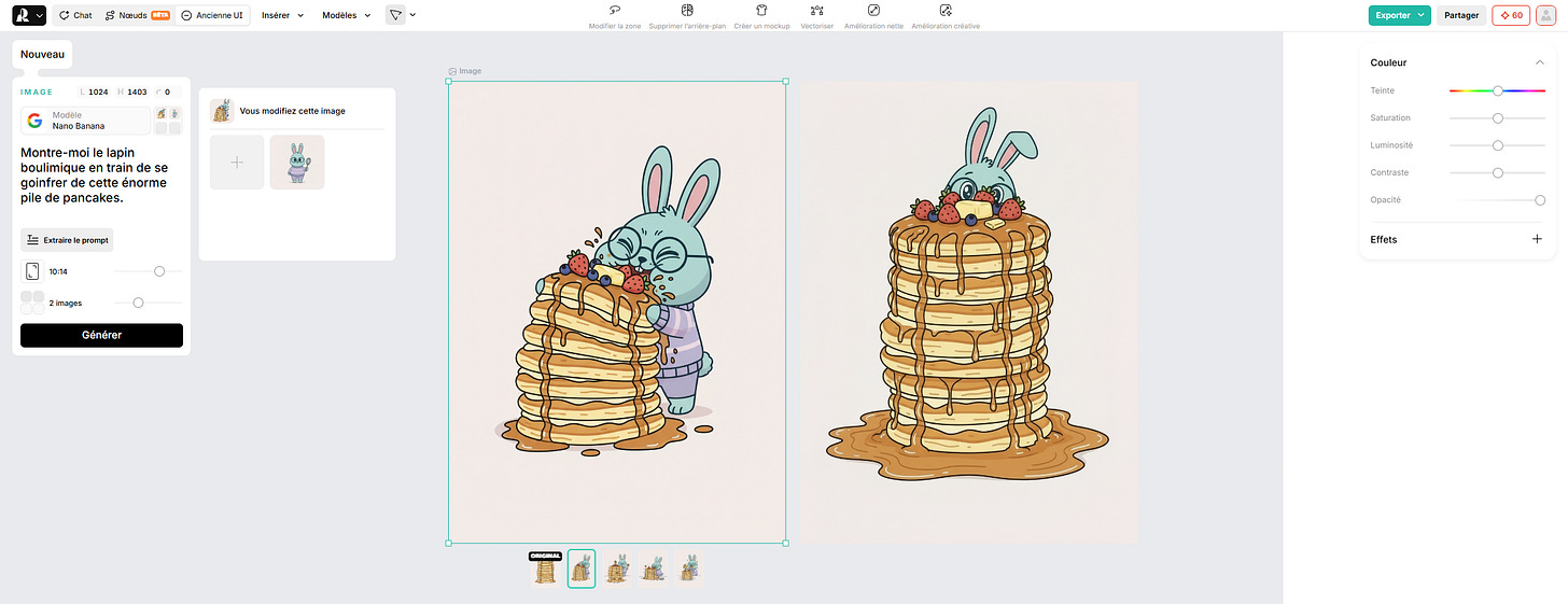 Concernant les outils, les choses évoluent super vite aussi. On vient d’un mode dans lequel on passe juste en entrée les paramètres d’un modèle. Exemple sur Recraft ci-dessous : je passe à Nano Banana l’image que je souhaite éditer, une image de référence, et un prompt.